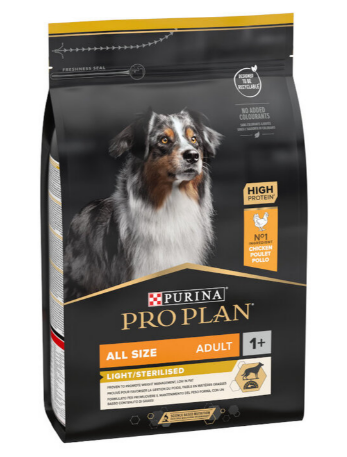 Purina PRO PLAN Adult Light / Sterilised All Sizes, anteriormente conocido como PRO PLAN Adult OptiWeight All Size, está formulado para perros adultos que necesitan controlar su peso, ya sea por tendencia a la obesidad o tras un proceso de esterilización.
