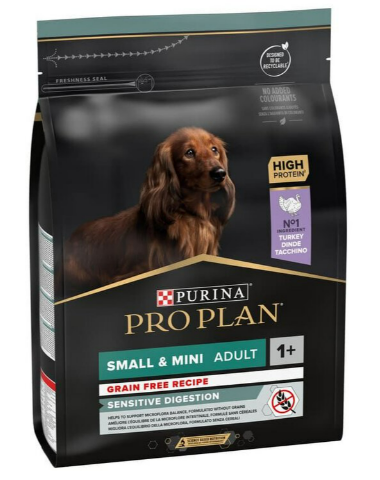 Purina PRO PLAN Sensitive Digestion Small & Mini Grain Free, anteriormente conocido como PRO PLAN OptiDigest Small & Mini Grain Free, es un alimento completo diseñado para perros adultos de razas pequeñas con estómagos delicados o digestiones sensibles.