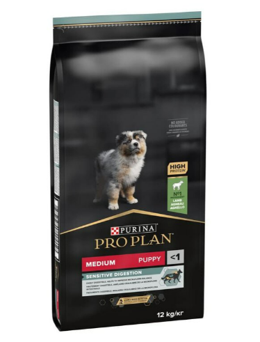 Purina PRO PLAN Puppy Medium Sensitive Digestion con cordero, anteriormente conocido como PRO PLAN Puppy OptiDigest Medium, es un alimento completo y equilibrado formulado para cachorros de razas medianas con estómagos delicados. También resulta ideal para hembras gestantes o lactantes, gracias a su alto contenido en nutrientes esenciales y calostro deshidratado.